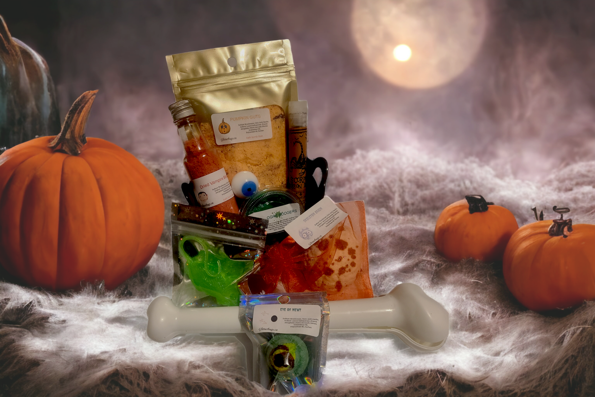 Comes with a cauldron, a glowstick wand, some fizzy fun items, slime bubble bath, and a few little seasonal toys!